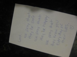 On Monday, I set up a little display which can only be called a shrine. Large glossy pictures of my Meggie and my Jenn, little outfits they wore, Jenn’s rattle, Meggie’s blanket, Jenn’s teddy bear –right in the middle of the living room. I wrote out their prayer and placed it beside a lighted candle. It was hard to do. I cried as I gathered the pictures. I cried to once again hold their things. I cried as I explained it to my family.